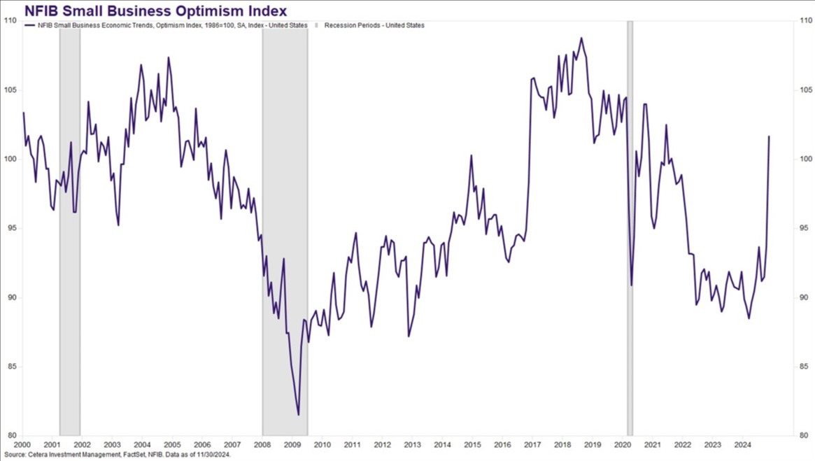 This positive sentiment is clearly visible in our first chart below. The NFIB Small Business Optimism index surged to a 41-month high of 101.7 in November, driven by a 41-point improvement in the percentage of owners expecting the economy to improve. If you look closely at the chart, you will notice that the last time we saw a surge in small business optimism like this was eight years ago in the wake of the 2016 presidential election. While sentiment improved post-election, inflation and the high costs remain the top concerns for small business owners.