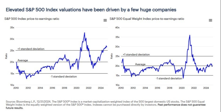 - Many of the economists and market strategists that our committee follows have noted that valuations on the stock market appear to be stretched. However, this has been driven by a handful of tech/AI stocks. By contrast, the equal-weighted index is trading much closer to historical norms.