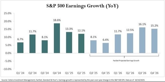 Corporate earnings will take center stage over the next couple of weeks. According to analysts, earnings growth is expected to slow to approximately 8%, down from the double-digit rates we have seen over the last three quarters. As shown below, earnings growth is expected to pick up in 2026, and investment analysts will closely watch earnings announcements for forward guidance on future results and expectations.
